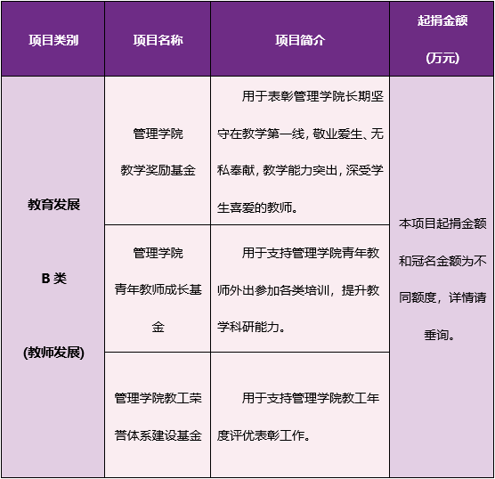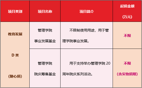 说明:对于未指明捐资用途的捐赠将全部纳入D类学院事业发展基金。